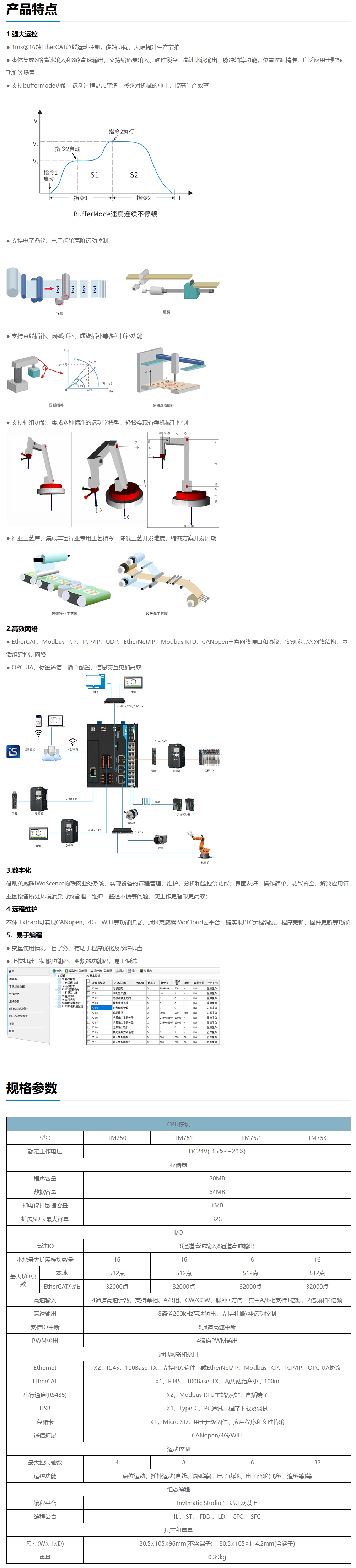 TM700系列高性能可编程控制器主要针对有较高运动控制要求和较复杂控制网络场景,在控制性能、通信能力、编程效率等方面有大幅提升和改善,让您更灵活的搭建控制网络,通过OPC UA更便捷的实现与信息层的数据交互,进一步提升设备节拍、缩短开发周期,带来更卓越的体验。