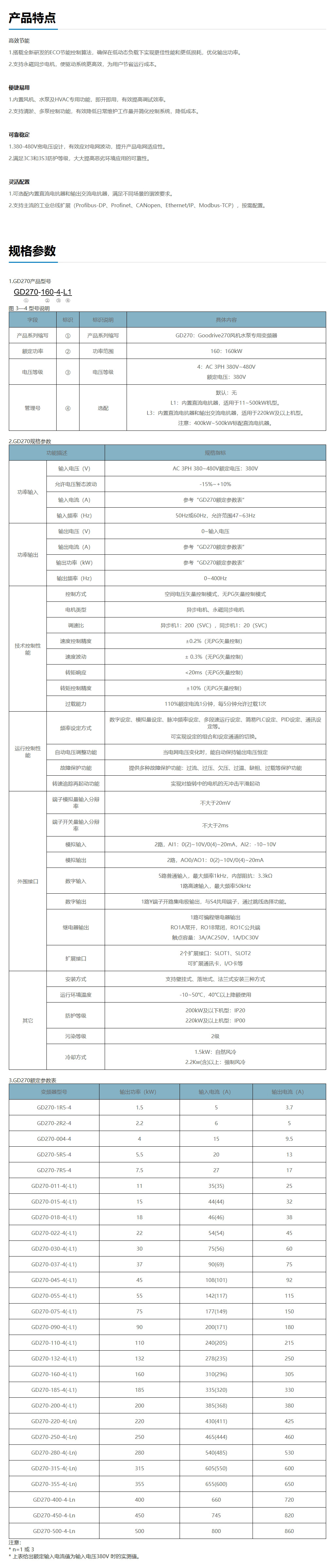 GD270系列风机水泵专用变频器GD270是英威腾Goodrive系列的新成员,内置风机和水泵行业应用功能,采用了优异的矢量控制算法以及节能技术,可以轻松驱动风机、水泵等负载,可应用于污水处理、市政供水供暖、暖通空调等行业。