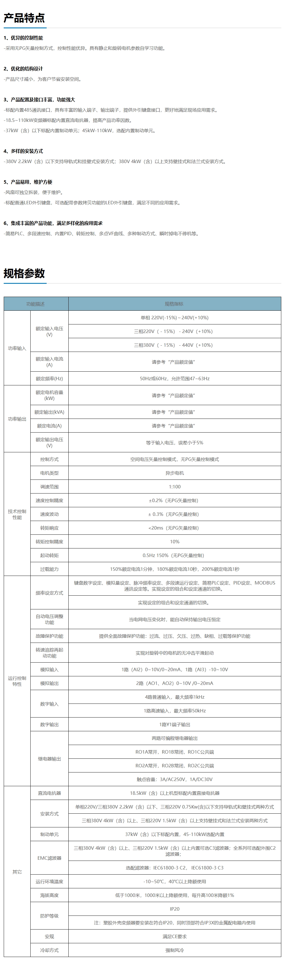GD20系列变频器采用无速度传感器矢量控制技术,产品具有优异的驱动性能和控制功能;产品硬件配置丰富、软件功能强大,在易用性及可靠性上均有较大的提升,能更好的满足各种工控场合的不同需求。GD20系列18.5KW~110KW标配内置直流电抗器,18.5~37KW内置标配制动单元,45~110KW选配内置制动单元,全系列独立风道设计,提升了产品可靠性和性能,增强了产品竞争力。