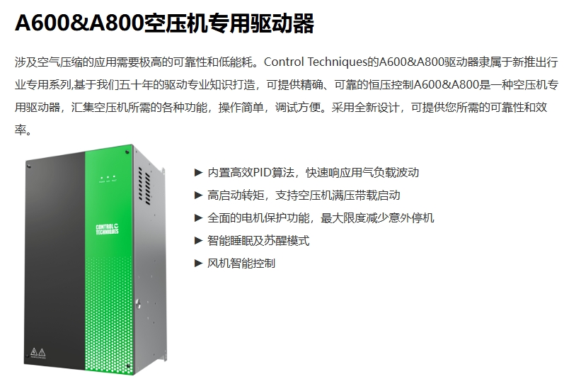 涉及空气压缩的应用需要极高的可靠性和低能耗。Control Techniques的A600&A800驱动器隶属于新推出行业专用系列,基于我们五十年的驱动专业知识打造,可提供精确、可靠的恒压控制A600&A800是一种空压机专用驱动器,汇集空压机所需的各种功能,操作简单,调试方便。采用全新设计,可提供您所需的可靠性和效率。
