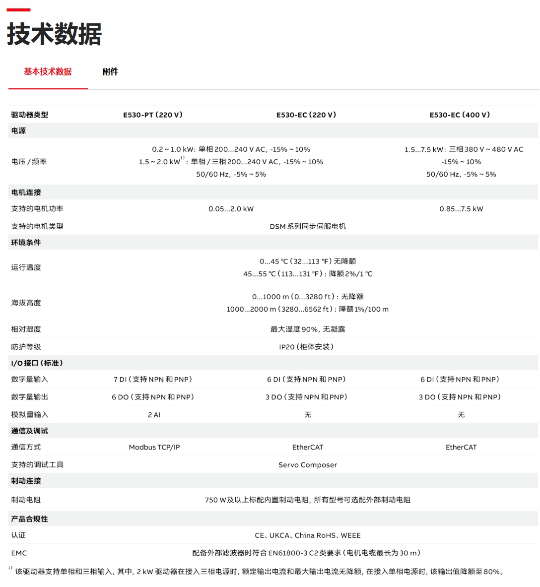 E530通用型伺服驱动器,提供脉冲型(E530-PT)和EtherCAT总线型(E530-EC)两种版本。驱动器的工作电压为单/三相200V~240V及三相380V~480V交流电压,功率范围覆盖0.2kW~7.5kW。驱动器提供位置、转矩和速度多种控制模式。E530脉冲型伺服驱动器支持Modbus TCP/IP通信协议,总线型伺服驱动器支持Ethe