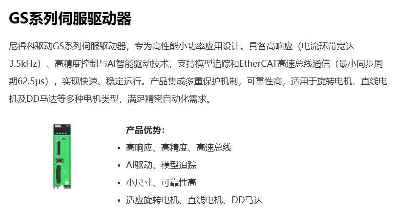 专为高性能小功率应用设计,具备高响应(电流环带宽达3.5kHz)、高精度控制与AI智能驱动技术,支持模型追踪和EtherCAT高速总线通信(最小同步周期62.5μs),实现快速、稳定运行。